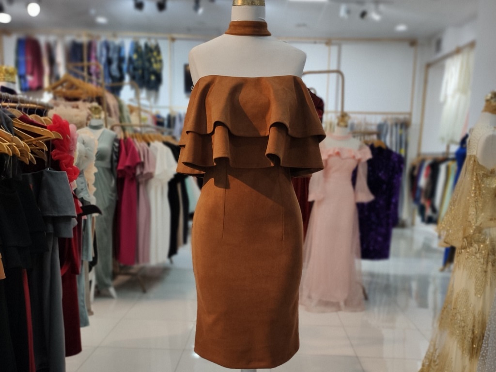 این مدل لباس مجلسی دلبری با گردنبند همسان با لباس، یقه دکلته و رنگ قهوه‌ای روشن یکی از مدل‌های جذاب لباس مجلسی است.