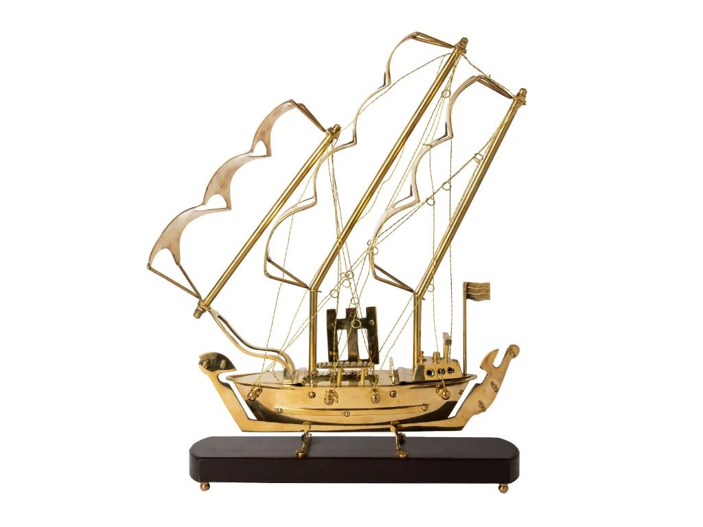 مجسمه کشتی همیشه جزو وسایل دکوری پرطرفدار است. این محصول از جنس استیل و چوب تهیه شده و به رنگ طلایی و قهوهای است.